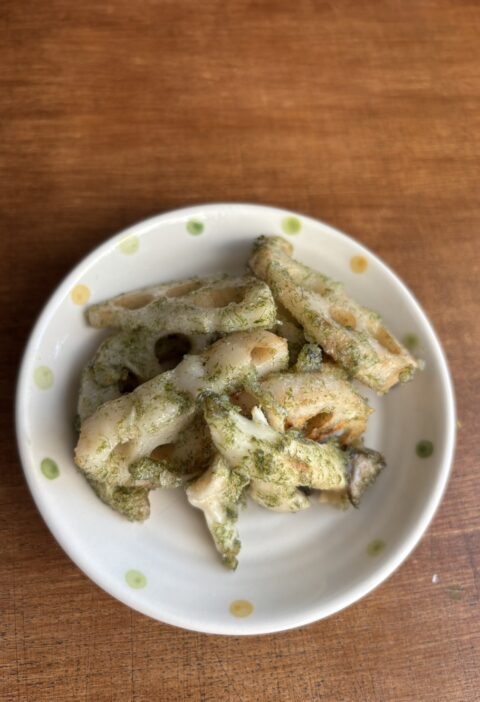 材料(4人分) ①レンコンは皮を剥きます。ピーラーで剥くと楽ですが凹凸のところは包丁で。 ②皮をむいたらレンコ …