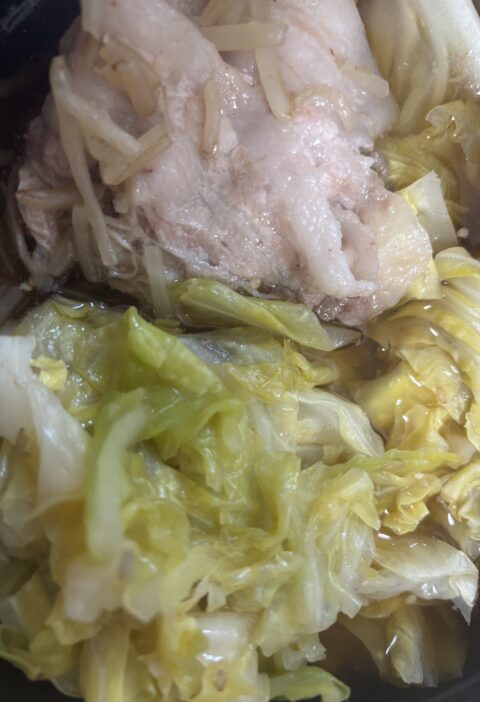 材料(2人分) 豚こま肉 120gキャベツ 1/6玉(約150g)卵 3個塩・こ …